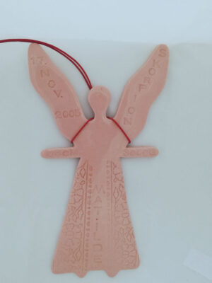 En dåbsengel er lavet i indfarvet ler, d.v.s farven går hele vejen gennem leret, englene har fået kjoler af blomstertryk fra et gammelt indisk træstempel og er til sidst glaseret med en blank glasur. Bagpå er de stemplet med mit mærke: ROX