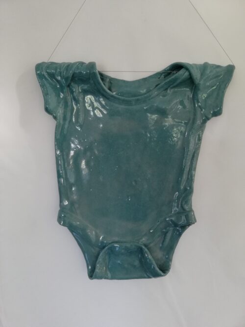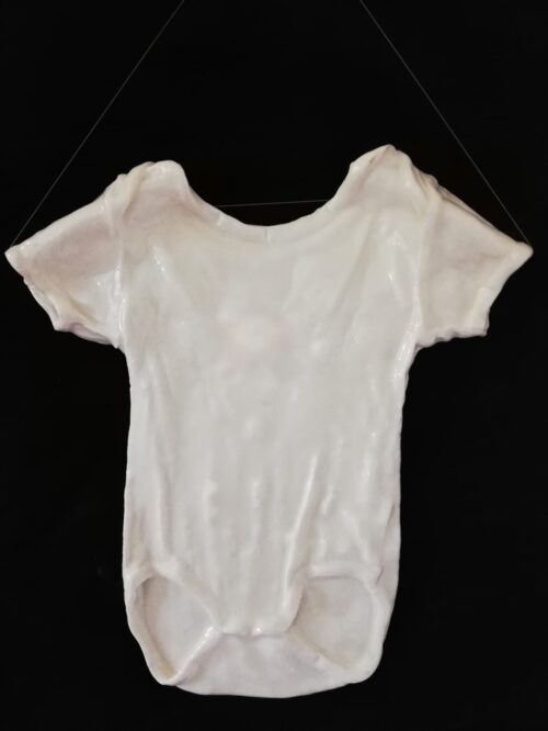 Som et kært minde fra en hurtig svunden babytid laver jeg jeres/dit barns lille bodystocking om til en nutidig og anderledes skulptur til ophængning.