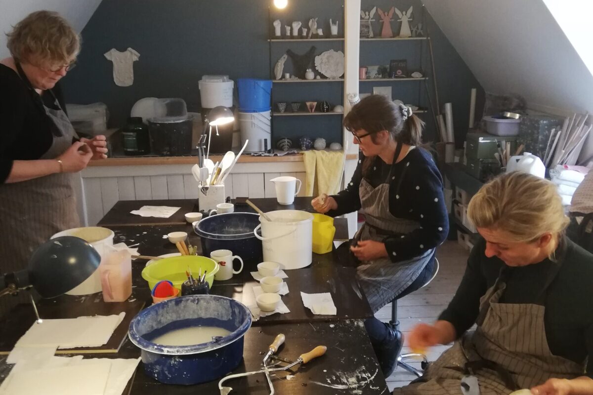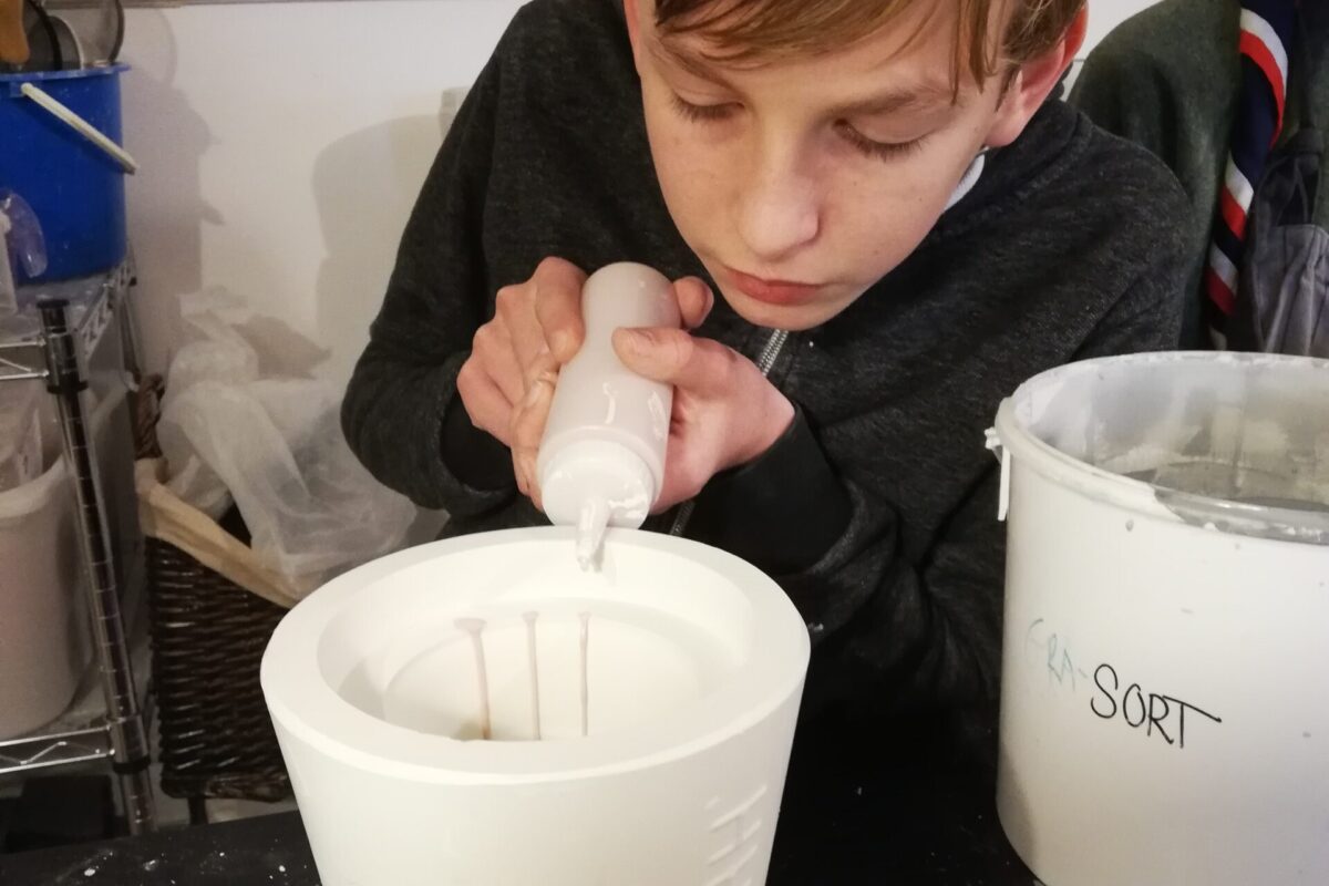 Jeg er vild med at støbe keramik – og jeg vil gerne dele denne oplevelse med dig på et kursus. Vi støber i flydende hvidt og farvet porcelænsler.